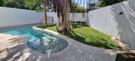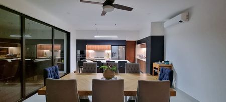 Cochera techada para 4 autos, cuarto de visitas o estudio con baño completo, cocina equipada y con área de despensa con lavabo, cuarto de servicio, cuarto de lavado, medio baño, amplia estancia, terraza con área de asador y estufa, baño exterior con regadera, alberca con diseño único y fuente tipo cascada, bodegas laterales y cuarto de máquinas.