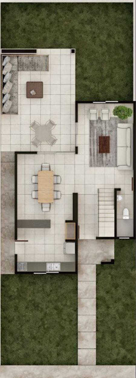 El modelo Balche plus cuenta con acabados de gran calidad, como lo son sus paredes de acabado tipo yeso liso, pisos ceramicos, meseta de granito y gavetería inferior en cocina.