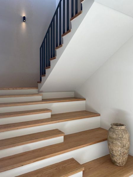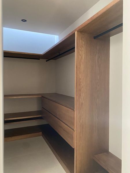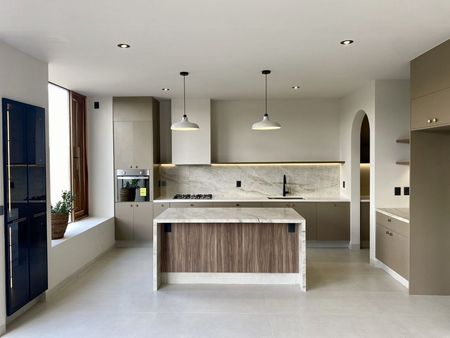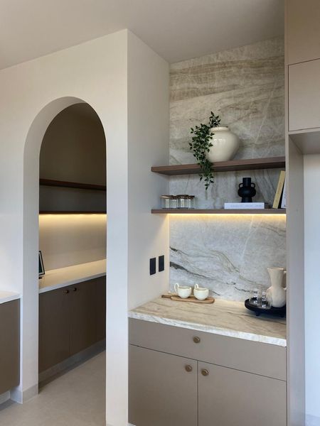Cocina es de Modul con cubiertas de cuarzo y cuarcita (isla y backsplash)