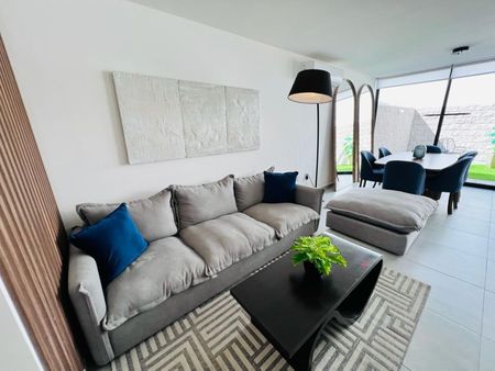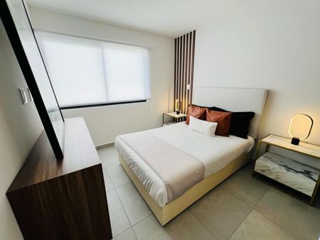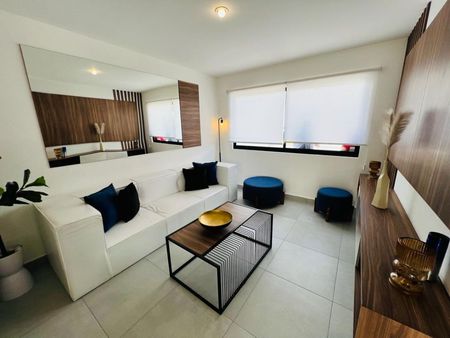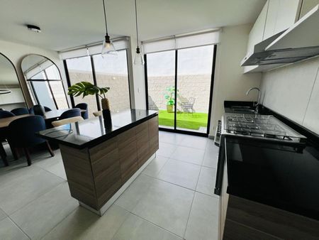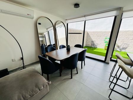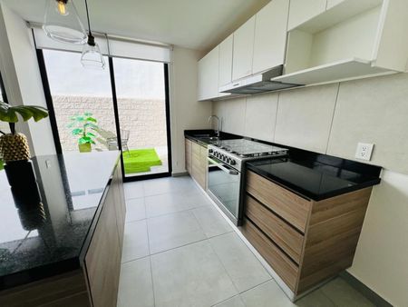 planta alta y una recamara en planta baja. Roof 3 baños completos (uno en pb) (lavanetas de Planta Alta mármol). Sala. Comedor. Cocina equipada con barra de granito. Área de Despensa. Área de servicio interna. Terraza / jardín. Preparaciones para AC. 2 lugares de estacionamiento. Acabados de la mejor calidad.