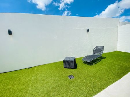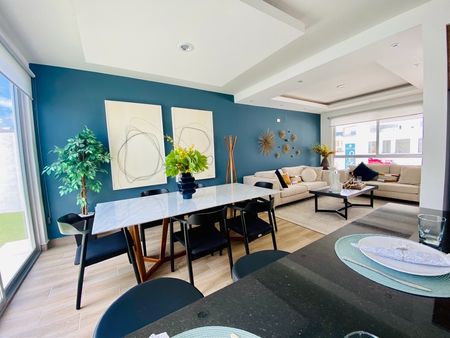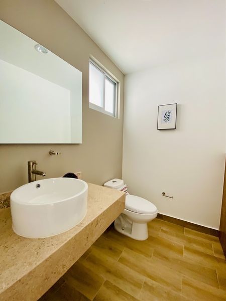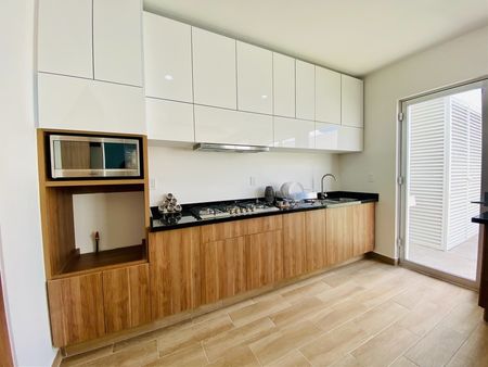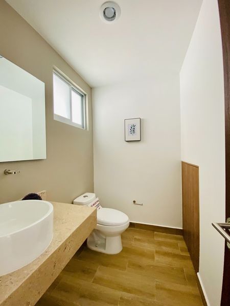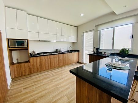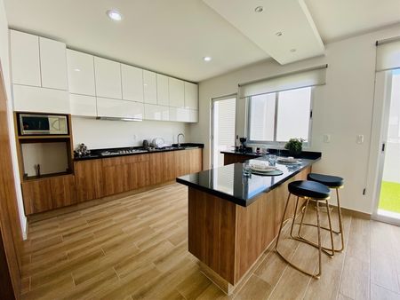 Planta baja: 2 estacionamientos semi techados, sala y comedor amplios, sala de tv en planta baja, cocina equipada, área de lavado, jardín trasero, acabados de lujo