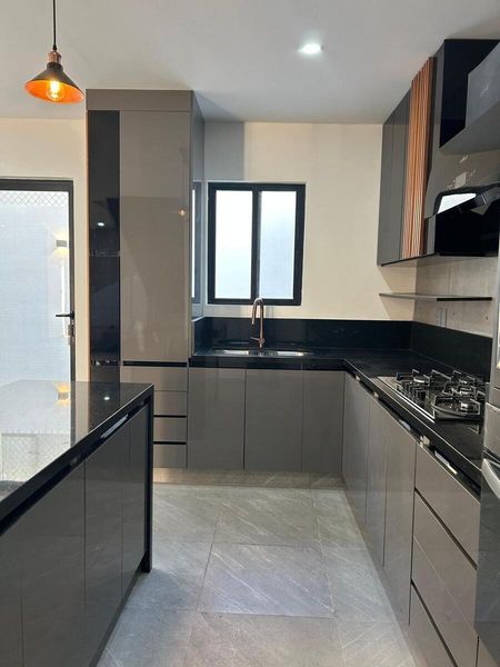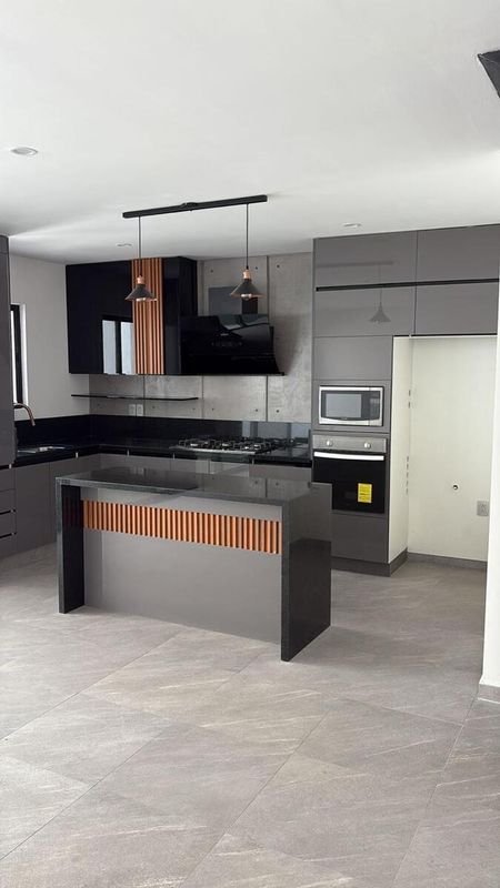 Cocina integral con isla y torre de hornos, mucho espacio de guardado