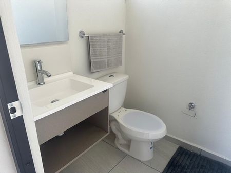 La casa cuenta en planta baja con cochera para 1 auto, ½ baño, área de sala, comedor y cocina y patio trasero con área de lavado. En planta alta cuenta con 2 habitaciones cada una con baño completo y balcon.