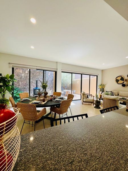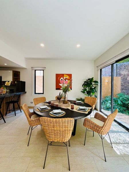 Planta baja: Pasillo lateral de servicio, espacio flex con baño completo, sala – comedor con amplio jardín, cocina equipada con alacena/bodega, cuarto de lavado.