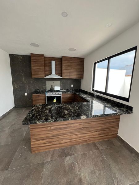 Sala comedor doble altura, cocina integral equipada con estufa, campana de acero inoxidable y barra desayunadora de granito, medio baño de visitas, cuarto de lavado, terraza con jardín y alberca, cuarto de servicio con baño y garage para 2 autos
