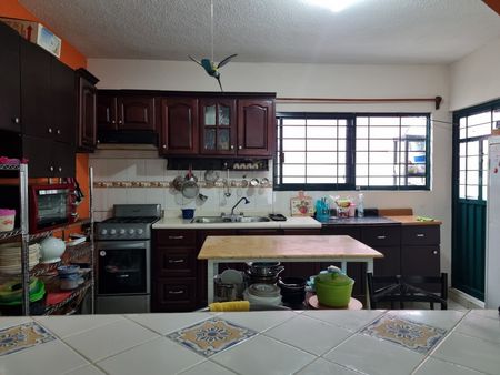 A la izquierda encontramos cocina con barra de cemento forrada de loseta de cerámica, con pared de arco revestida de piedra aparente, cocina con muebles de madera en puertas y paredes “cocina integral” con gabinetes extras.