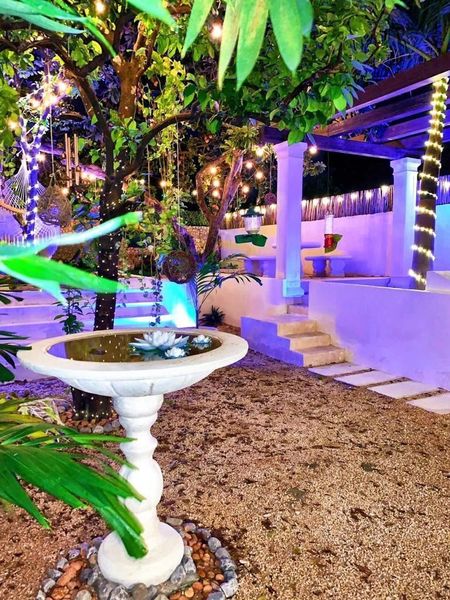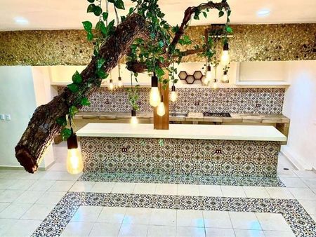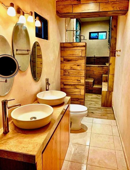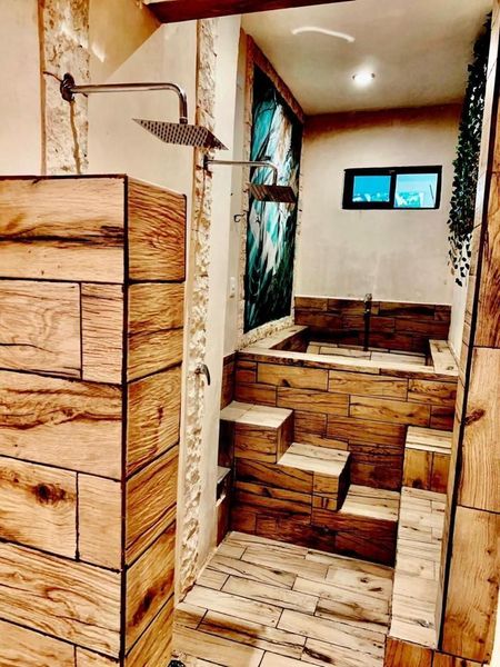 Comedor (6×6.5m) y cocina (6.5×2.5m) amplios con vista panorámica a los jardines, doble altura con iluminación indirecta, ideal para vivir o para negocio Airbnb, árboles frutales (mamey, huaya, agucate, naranjos), jardín interior, piscina (7x3.5) y asoleaderos con acabados Chukum, dos baños completos con regadera, el baño principal de 7.5m de largo con doble lavabo, doble regadera y tina para dos personas.