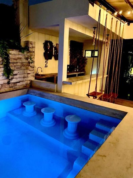Sala principal de 5 por 4.5m. Dos amplias habitaciones (5×4.5m) con closets, Instalación eléctrica, hidráulica y sanitaria nuevas, aires acondicionados nuevos, agua potable, pozo para llenado de la alberca, sistema presurizador de agua, puerta exterior y ventana en madera de cedro nuevas.