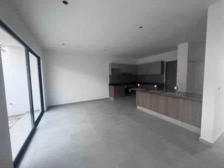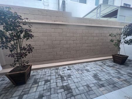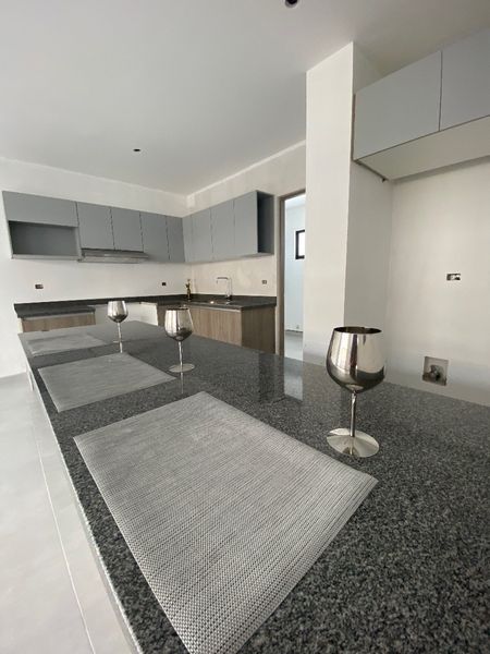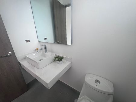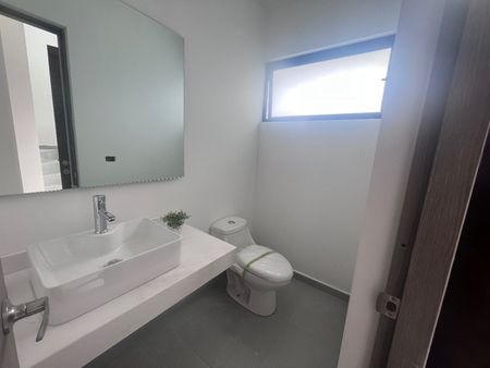MEDIO BAÑO, ESPACIO PARA UN ESCRITORIO O BODEGA ABAJO DE LAS ESCALERAS, SALA, COMEDOR, COCINA ABIERTA CON BARRA DE GRANITO, ÁREA DE LAVADO, JARDÍN.