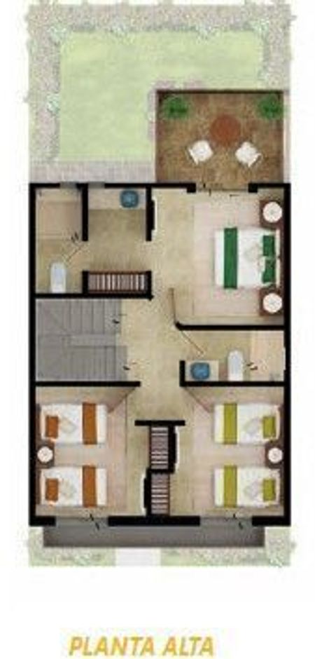 Planta Alta: Recámara principal con baño completo, walking closet y terraza, dos recámaras con closet y baño completo.