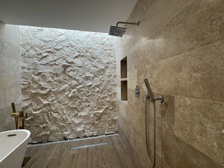 Carpintería de parota y piedra “crema maya” en baños