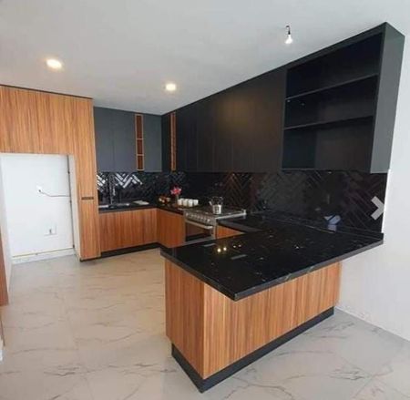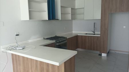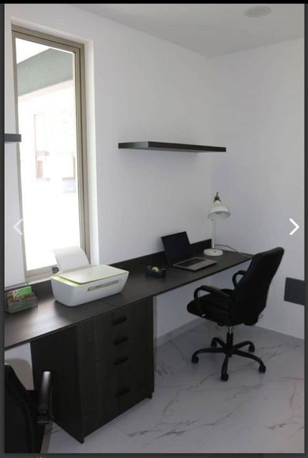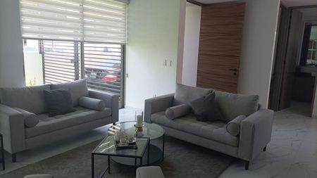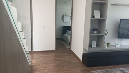 Sala, comedor, oficina, medio baño, cocina integral equipada abierta, bar, área de lavado, jardin de 34 m2, estacionamiento para 2 autos techados y uno descubierto.