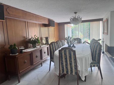 Planta baja: Cochera techada para 2 autos en batería al frente de la casa. Vestíbulo de acceso, sala con bar a doble altura, medio baño de visitas, closet de abrigos, sala, comedor con salida al jardín privado, cocina, antecomedor con salida a jardín. Alacena, lavandería, cuarto de servicio con baño, bodega.