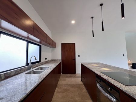 Moderna casa en venta con cocina equipada, piscina, cochera techada y portón.