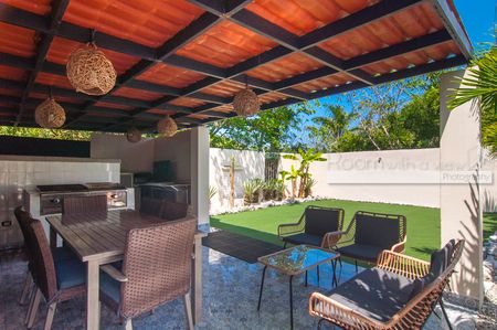 Esta impresionante villa de 4 habitaciones y 3 baños ofrece una distribución abierta y techos de doble altura que crean un ambiente espacioso y luminoso. Las áreas de sala y comedor se integran armoniosamente con una terraza techada con mosquitero, la cual conduce a un hermoso jardín privado con alberca y un área con asador al aire libre, perfecta para reuniones y momentos inolvidables. La recámara principal ofrece un balcón privado, vestidor y baño en suite de lujo. Totalmente bardeada para mayor privacidad y seguridad, esta casa es un verdadero santuario para usted y sus huéspedes.