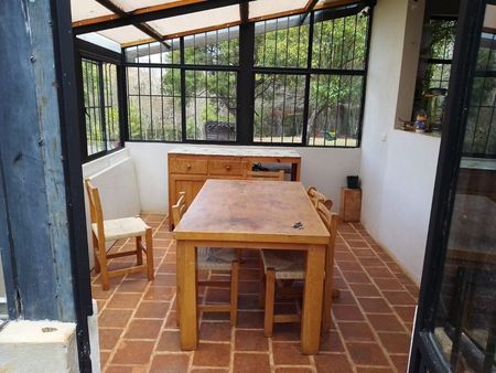 Casa de una planta con sala, cocina, comedor/solario, dos recamaras, 1 baño completo y vestidor, porche y patio de lavado.