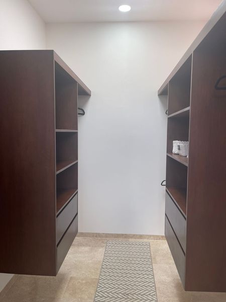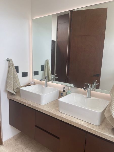 Mesetas de mármol en baños con mueble de madera en caobilla