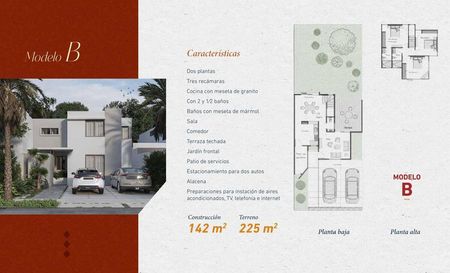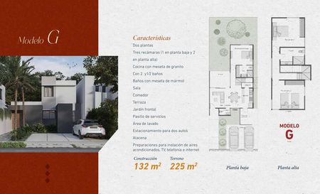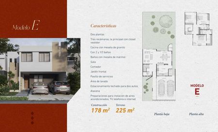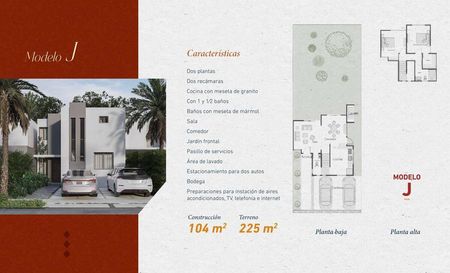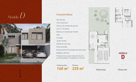 Casa de dos plantas con 2 habitaciones, 1 baño y medio de visitas o con tres habitaciones con 2 baños y medio de visitas, baños con meseta de mármol, cocina con meseta de granito, sala, comedor, jardín frontal, patio de servicios, estacionamiento para 2 autos , Bodega y Alacena, ( 8 modelos a escoger)