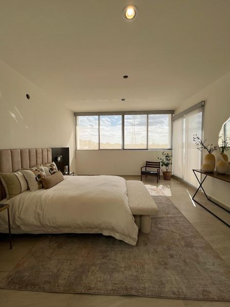 Recámara principal con baño con doble lavabo, closet vestidor y balcón