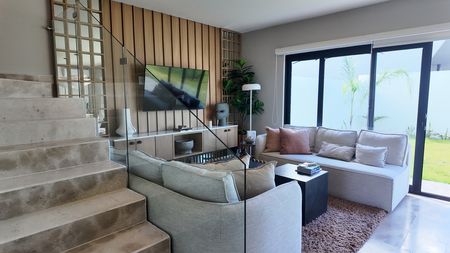 Planta baja: Sala, Comedor, Cocina equipada, Medio baño, Cuarto de servicio con baño completo, Jardín, Estudio, Espacio para 3 autos