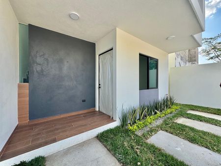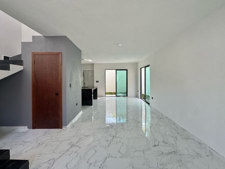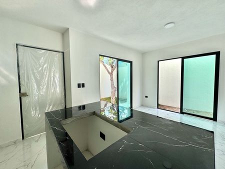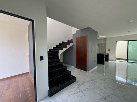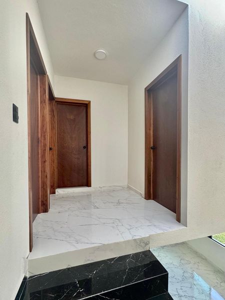 Incluye pisos de loseta con apariencia de mármol, al igual que la barra e isla de la cocina en color negro. La fachada cuenta con losetas tipo duela de madera. Puertas interiores de madera parota, ventanas de aluminio.