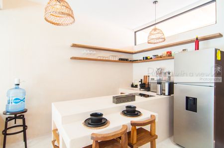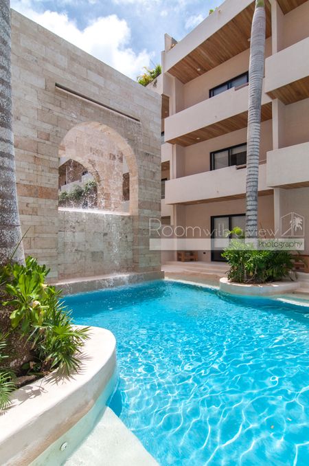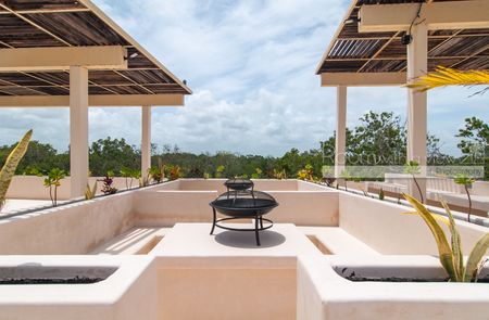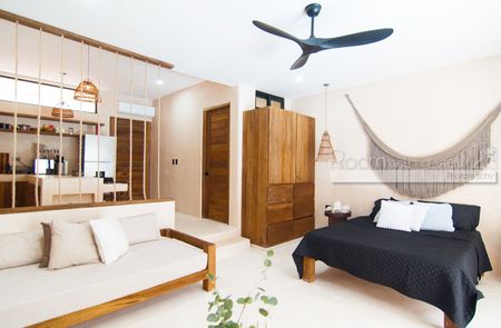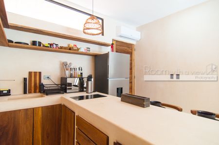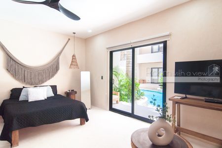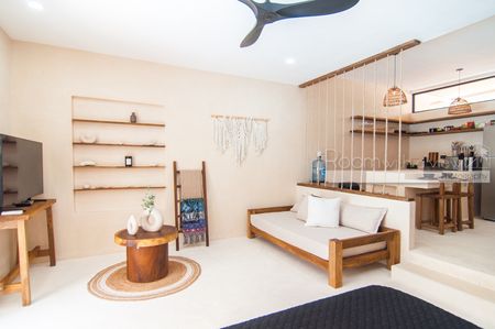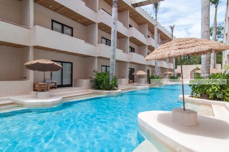 Esta unidad cuenta con cocina equipada y amplia área de estar y descanso que se abre a una terraza techada con acceso directo a la alberca. Está bellamente diseñada con materiales naturales en todo el espacio, además de cerraduras inteligentes e internet de alta velocidad para mayor comodidad. El complejo ofrece amenidades de estilo resort, que incluyen múltiples albercas, gimnasio, rooftop con terraza, espacio de coworking, acceso exclusivo a club de playa y seguridad las 24 horas.