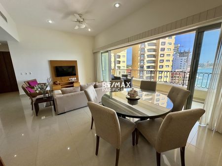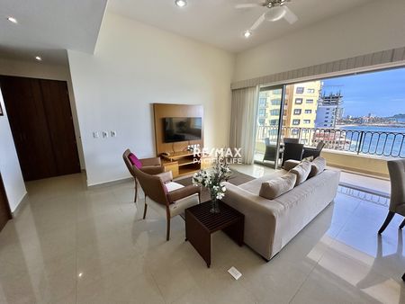 las tres que conforman el complejo Gavias, una construcción emblemática que se alza imponente frente al mar. Desde el piso 7, este espacioso condominio de doble altura ofrece una espectacular vista panorámica que abarca las tres islas y el puerto de Mazatlán, proporcionando un entorno visual inigualable. Con tres recámaras y tres baños, este condominio es el hogar perfecto para quienes buscan confort y lujo. Cada habitación está completamente amueblada, lista para que sus residentes disfruten de la tranquilidad y belleza del entorno. La decoración y el mobiliario han sido cuidadosamente seleccionados para complementar el estilo contemporáneo y elegante del espacio, creando una atmósfera cálida y acogedora.