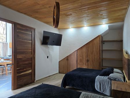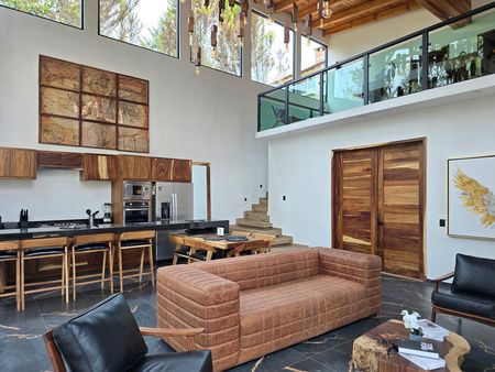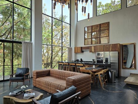 Una cocina totalmente equipada que le da una vista única a esta propiedad, cada espacio es elegante y pensado en el confort , la doble altura de esta propiedad habla por si sola y te regala una luz natural que puede pasar fácilmente con la vista de cristal de 9mts.