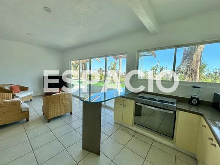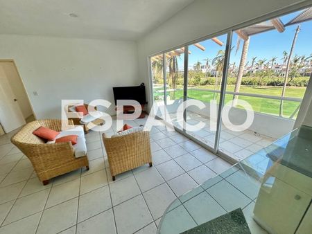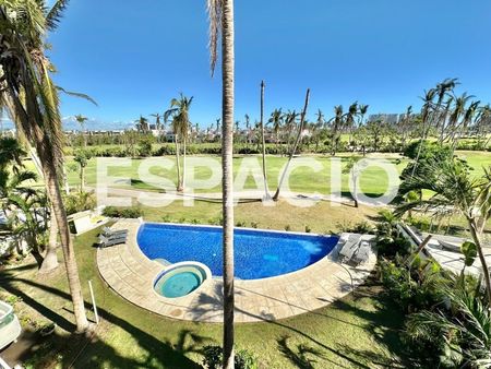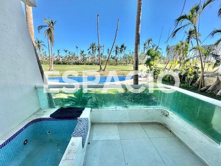 - Áreas de Alberca, con área jardinada y terraza con muebles de exterior a disposición, y vista a Campo de Golf de Vidanta.