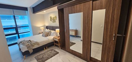 El departamento se entrega equipado con elegantes acabados, refrigerador, horno de microondas, parrilla eléctrica, lavasecadora y persianas