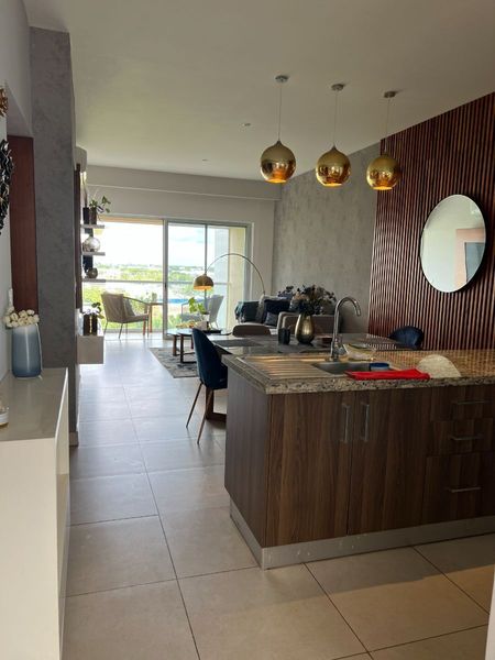 - Cocina integral con estufa, campana, horno microondas, refrigerador, barra desayunadora en granito y gavetas