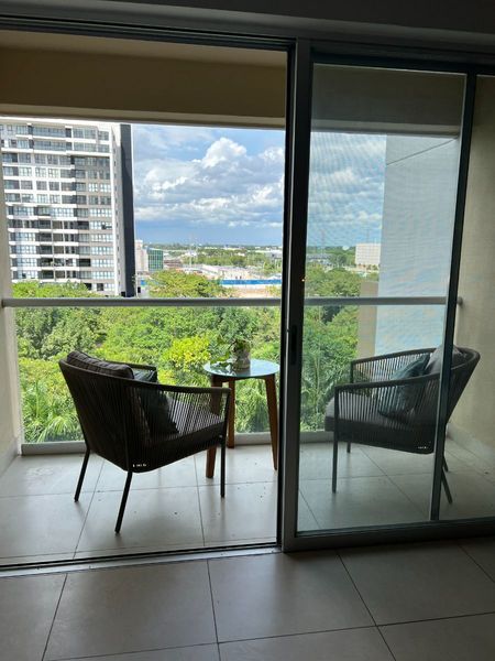 -Terraza con una vista espectacular, hacia la piscina y al parque con mesa y 2 sillas.