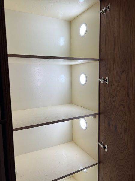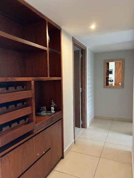 -Cantina en madera empotrada en pared con cava de vinos y mesa para servicio.