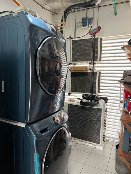 -Cuarto de lavado con repisas y centro de lavado con lavadora y secadora