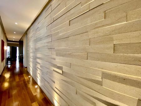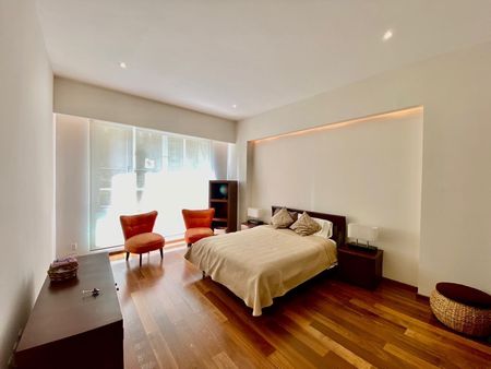 3 recamaras, cada una con baño y vestidor, estudio, sala, comedor, cocina cerrada, medio baño de visitas, 3 lugares de estacionamiento independientes y bodega.