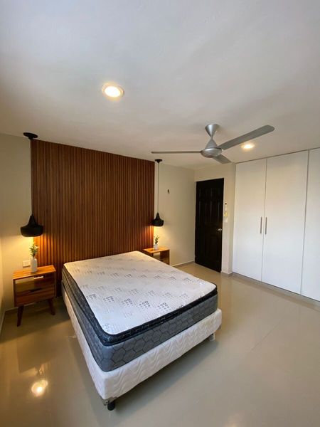 1 habitación con cama matrimonial con ventilador, aire acondicionado y clóset