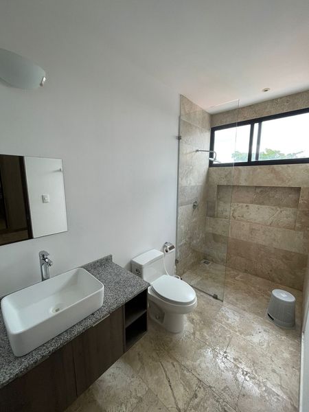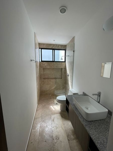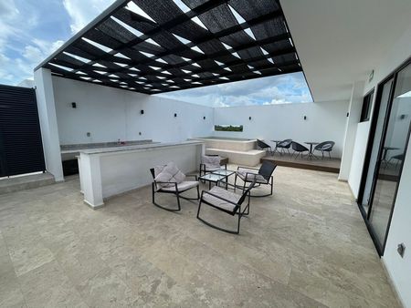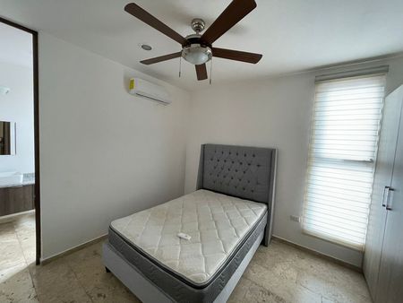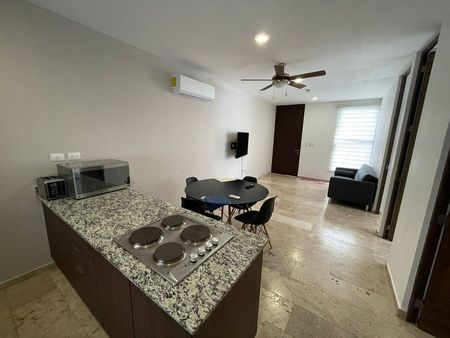 Este departamento cuenta con 2 recámaras, 2 baños completos, cocina equipada con refrigerador y horno de microondas.