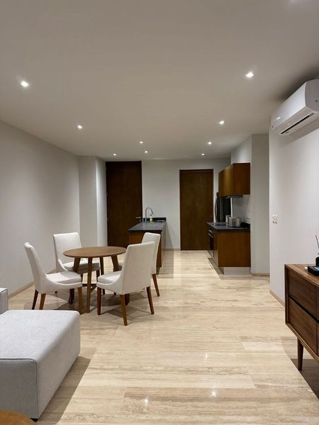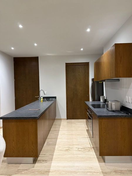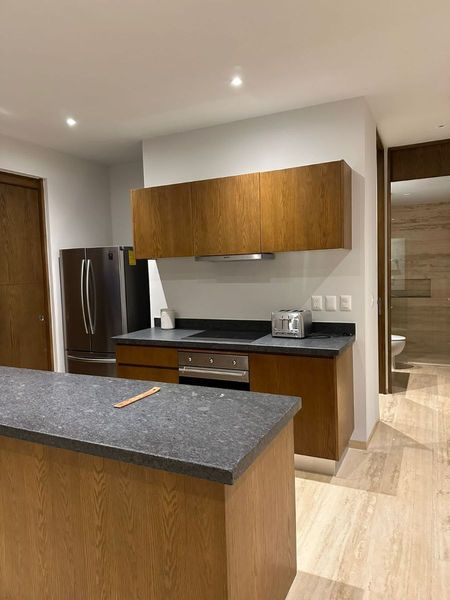 Muebles de sala, comedor, cocina equipada con electrodomésticos.