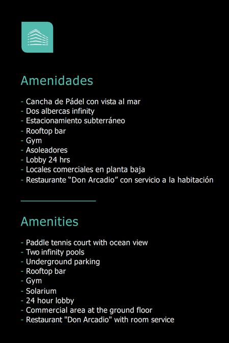 Cuenta con una gran cantidad de amenidades como cancha de Paddel con vista al mar, 2 Albercas Infinity, Rooftop Bar, Gym, etc., que harán de tu estancia en Playa del Carmen una experiencia inolvidable.