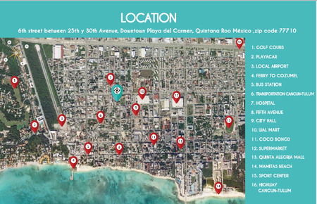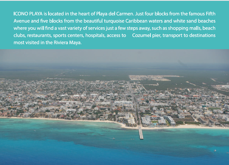 ICONO PLAYA esta Ubicado A tan solo cuatro cuadras de la mundialmente famosa 5ta avenida de Playa del Carmen, su excelente ubicación ofrece rápido acceso a una amplia variedad de comercios, servicios, entretenimiento y atractivas playas.