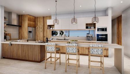 Con acabados en mármol, carpintería de encino, cancelería anti huracán, cocina equipada, horno, campana, parrila, doble tarja, aires acondicionados, cuarto de servicio, closet, cancelería en baños,