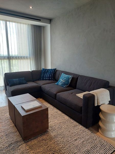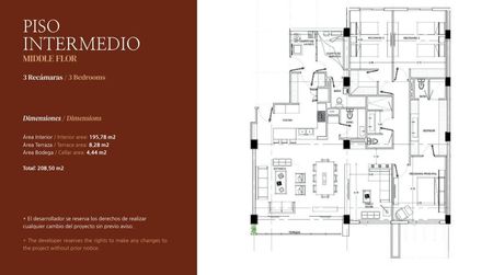 El departamento consta de 233.54m2 de los cuales 204.10m2 corresponden al área privativa interior con terraza, 25m2 corresponden a 2 cajones de estacionamiento de uso exclusivo y 4.44m2 de una bodega privada.
