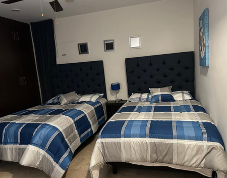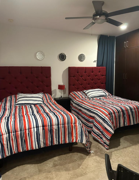 Todas las 4 recámaras con baños completos y AC’s. Una de estas recámaras es de servicio con área reducida y con cama canguro para dos personas.