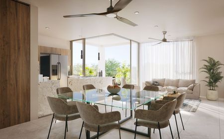 Gavetas en cocina, área con instalaciones para lava-secadora, parrilla eléctrica vitrocerámica de 5 quemadores, clóset en recámaras, aire acondicionado en la recámara principal, calentador eléctrico de depósito, grifería marca HELVEX, tarja de acero inoxidable, Granito en meseta de cocina, piso de mármol, cancelería línea europea de aluminio color natural serie 80, vidrios con filtro UV en el área de terraza, cubierta de Quarzo en cocina, puerta principal de madera de Tzalam, puertas interiores de madera de Sapelli, iluminación LED y cubiertas de mármol en baños.