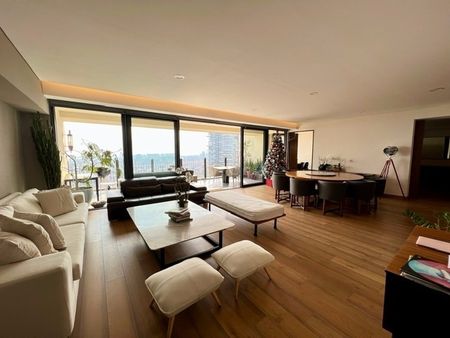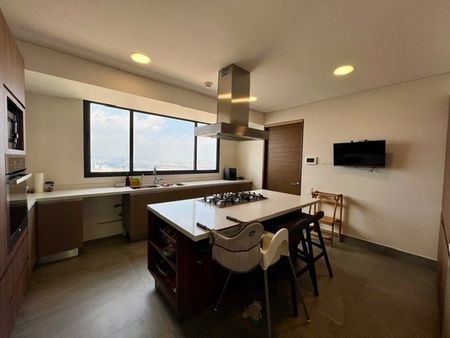 Departamento en la torre Dátil con acabados de madera de ingeniería, mármoles, granitos, vidrios templados, vista a toda la baranda de Bosques, terraza de gran tamaño para poner una sala y comedor de exterior. Techos de doble altura, cocina integral y cuarto de servicio.