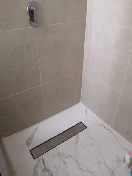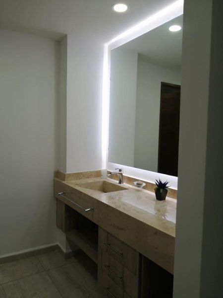 Baños con espejos de pared con luz indirecta.piso en la ducha antiderrapante con tarjetas modernas Rectangulares como de 40 Cm