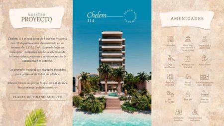 "Chelem 114" es una torre de 8 niveles y cuenta con 10 departamentos desarrollado en un terreno de 1,112.21 m2, diseñado bajo un concepto endémico donde la selección de los materiales coexisten y se fucionan con lanaturaleza y el entorno.