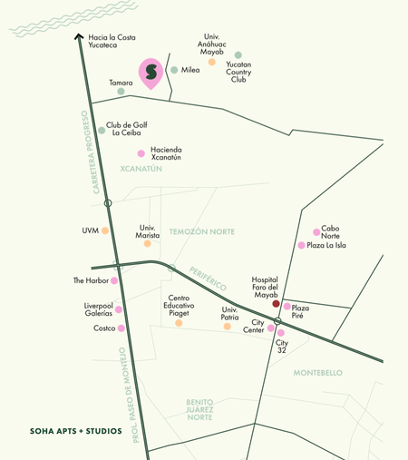 Ubicados estratégicamente en la zona con más plusvalía del Norte de Mérida, cerca de la Universidad Anáhuac del Mayab, el Yucatán Country Club y las famosas playas de Progreso.