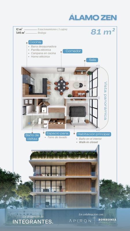 El edificio cuenta con 22 exclusivos departamento con acabados de lujo y equipados, distribuidos en 5 niveles, con lobby y estacionamiento techado, elevador, amenidades para disfrutar y amigables con las mascotas.