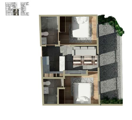 Este depa cuenta con 45.67m2 de interiores + 17.57m2 de terraza privada. En dicho espacio cuentas con 2 cómodas recámaras con closet, 2 baños y una cómoda estancia con ventanal hacia la terraza privada. Por ser un edificio bajo, la iluminación es muy buena.
